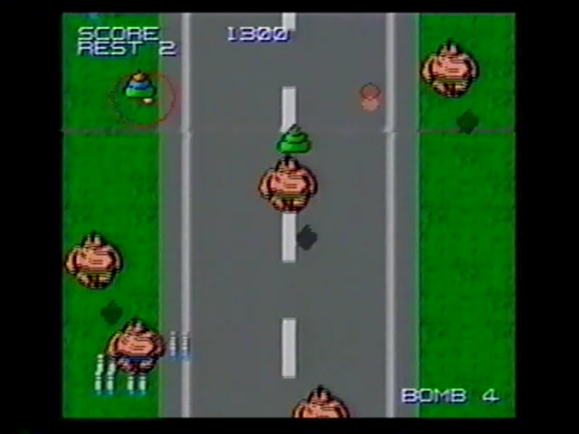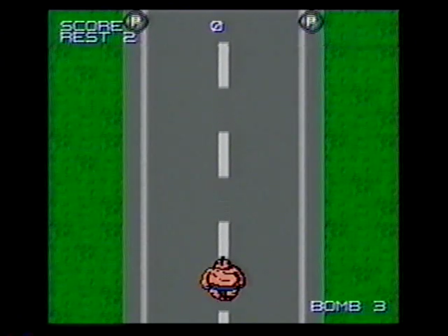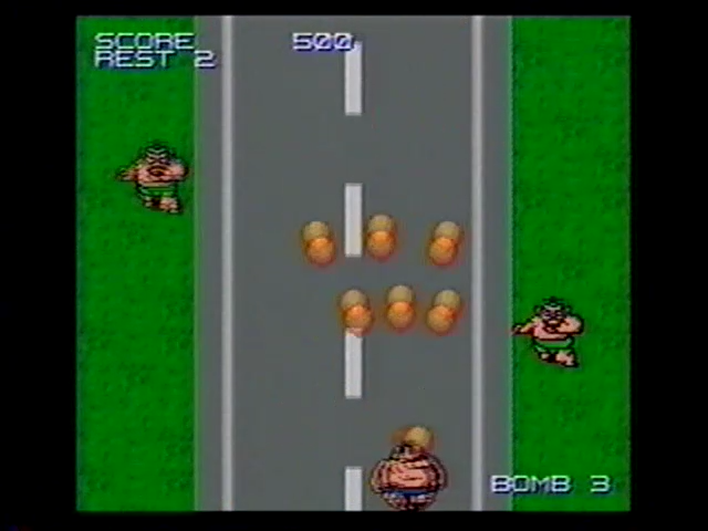 | 最初のボス「コニシキ」です。無数のハリテから風圧(指弾?)が飛び、口から口弾(もの凄くくさい口臭の弾)が飛んできます。なぜ道路の真ん中に土俵(前線基地)があるのかは、気にしないこと。 |