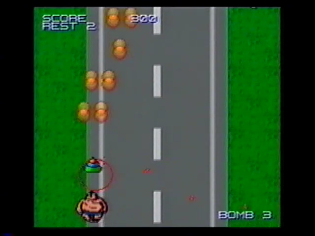 | 最初は道路からはじまります。「P」と書いてあるのはアイテムBOXで、破壊すると色とりどりの糞がでます。これでパワーアップします。攻撃グラフィックはほぼデフォルトのままですが、そこはまったく気にならない。それを忘れさせる魅力(ツッコミ所)があるから関係ありません。 |