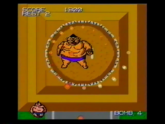 | 敵の力士はゆっくり移動しながら弾をバラ撒いてきます。まだ最初なので小手調べといったところ。ヨコズナにソックリのキャラは味方で、共に戦っている演出です。マワシの色が違うだけで同じグラフィックです。なので混同しがち。 |