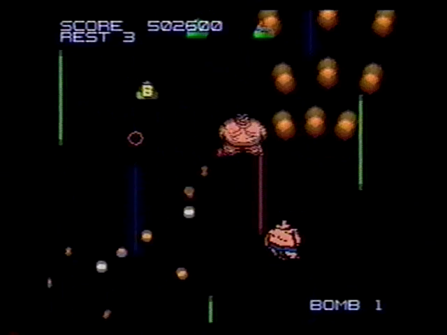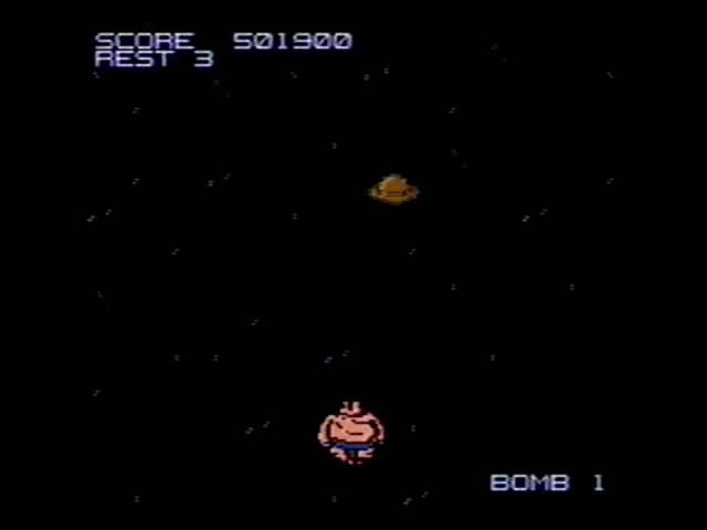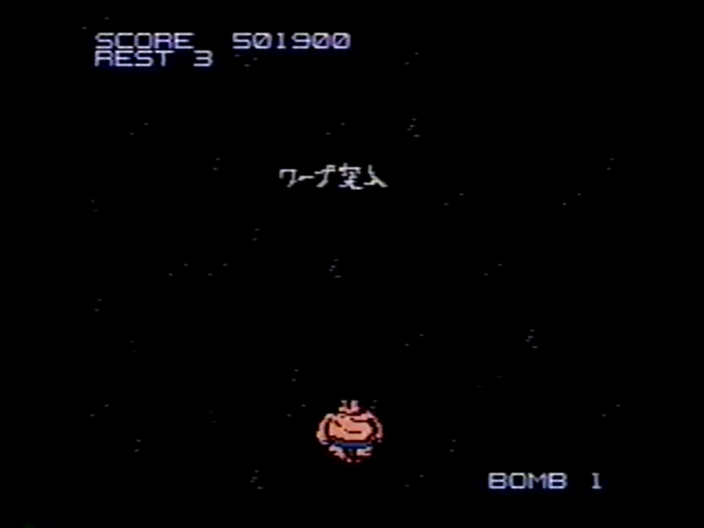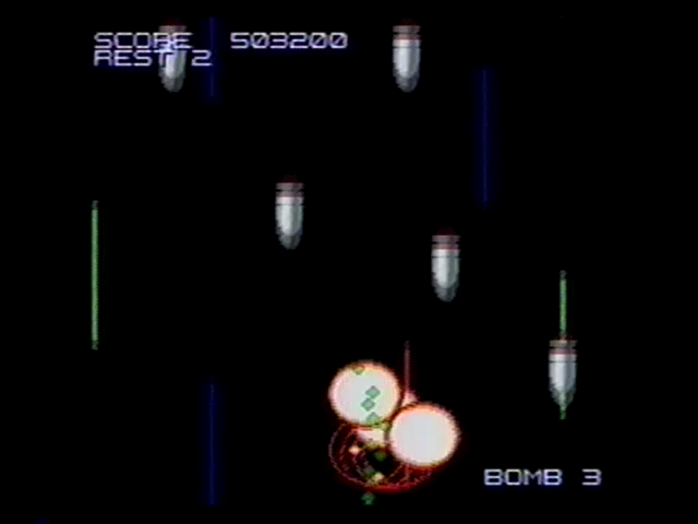 | スクロールスピードも速く、敵も速いですが、障害物がないので動き回ればラク。ですが、異常に速いミサイルは危険。数が多いので破壊しきるのは無理。ま、前のステージに比べるのラクだけど。(死んでる) |