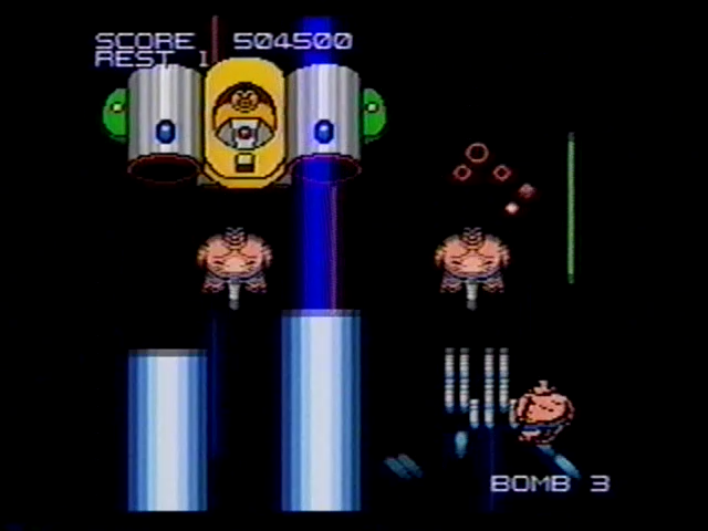 | 敵の攻撃が激しく巨大な2連装ビームが強烈ですが、発射タイミングは一定なのであらかじめ離れれば当たらない。比較的普通のボスなのでコメント終了。なお、セリフの「オノレェ!」は勝手に付けました。実際はカットインがありません。(忘れたようです) |